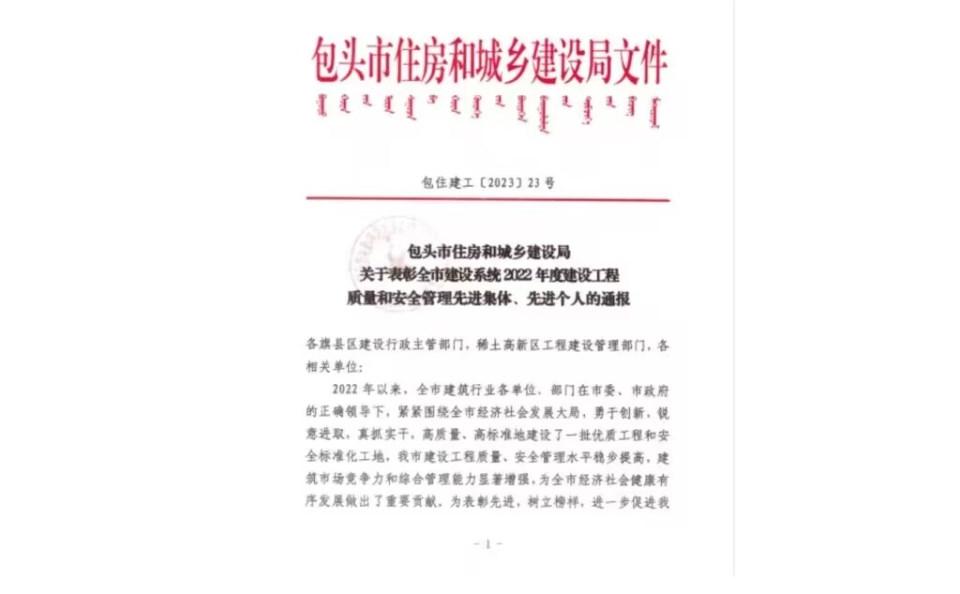 九分公司内蒙古农业大学项目荣获包头市“2022年度建设工程质量和安全管理先进集体”荣誉称号