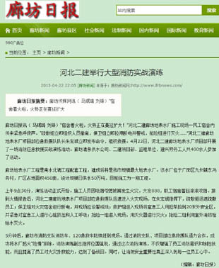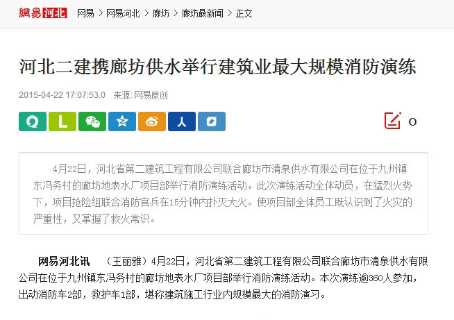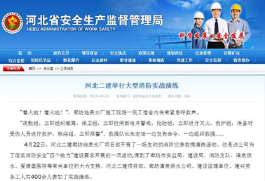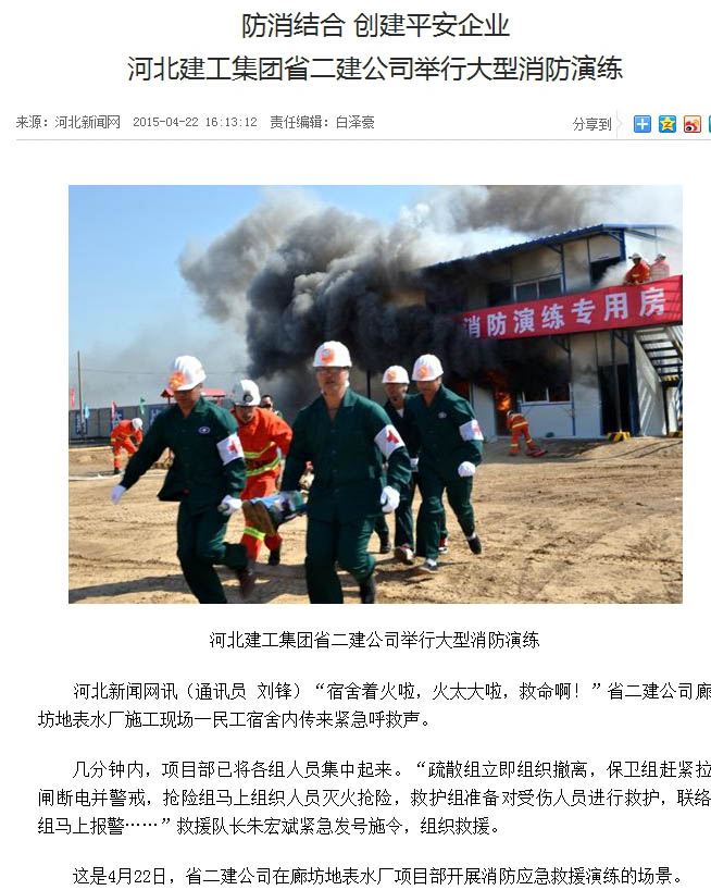 河北新闻网等多家媒体报道我消防实战演练 来源: 修改时间:2015.04.23 浏览:7264 河北新闻网等多家媒体报道我消防实战演练 2015年4月22日,公司在廊坊地表水厂组织了一次施工现场消防应急救援实战演练。来自业主、监理和劳务队的400多人参加了此次活动。 当日,河北新闻网、河北安全生产杂志、网易河北、廊坊电视台、廊坊日报等多家新闻媒体对此进行了报道。(闫子明) 上一条 返回列表 河北二建:下一条