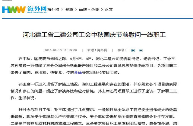 人民日报海外网等10余家媒体报道公司领导双节期间慰问一线职工