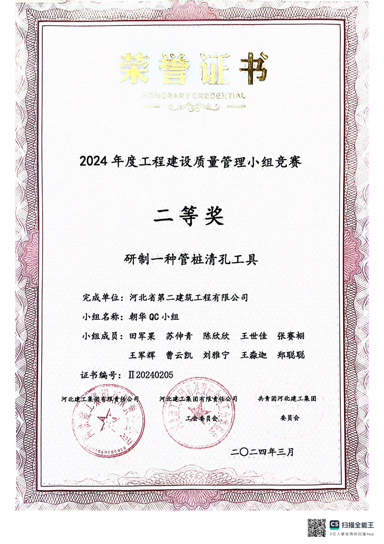 近日,由河北建工集团组织的“2024年度工程建设质量管理小组活动竞赛”成功落下帷幕,公司共有两项成果获奖,三分公司朝华QC小组的《研制一种管桩清孔工具》荣获二等奖,一分公司质量先锋QC小组的《提高热力管道承插连接一次验收合格率》荣获三等奖。